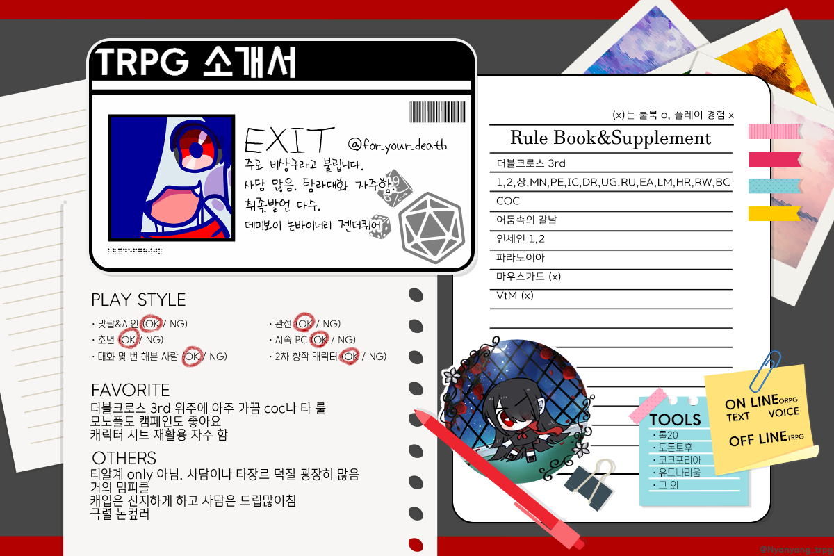 일대일보다는 1인 시나리오에 가까우며 KPC와 초면이어도 즐길 수 있는 디스토피아 시티 탐사계 캠페인의 1편 시나리오입니다. RP 위주의 플레이를 선호하시는 분들은 아쉬우실 수도 있습니다. 세계관의 특수성이 강해 위화감을 느끼실 수 있습니다. 기존 탐사자와 신규 탐사자 상관없이 가능한 시나리오입니다. 탐사자는 디스토피아 사회에서 태어난 인물로, 인류의 역사 와 국가의 개념을 알지 못하며 아무것도 모르는 신생아와 같습니다. 디스토피아 도시에서 사용하는 공용 언어는 탐사자의 국적에 맞춥니다. 영어권이 아니더라도 영어를 표기 식에 혼용하고 있습니다. 기술력과 문명은 인공지능이 상용화된 근미래 로 가정하여 작성하였습니 다. 시나리오에 표기되지 않은 다른 설정은 수호자가 편하게 만들어주세요.